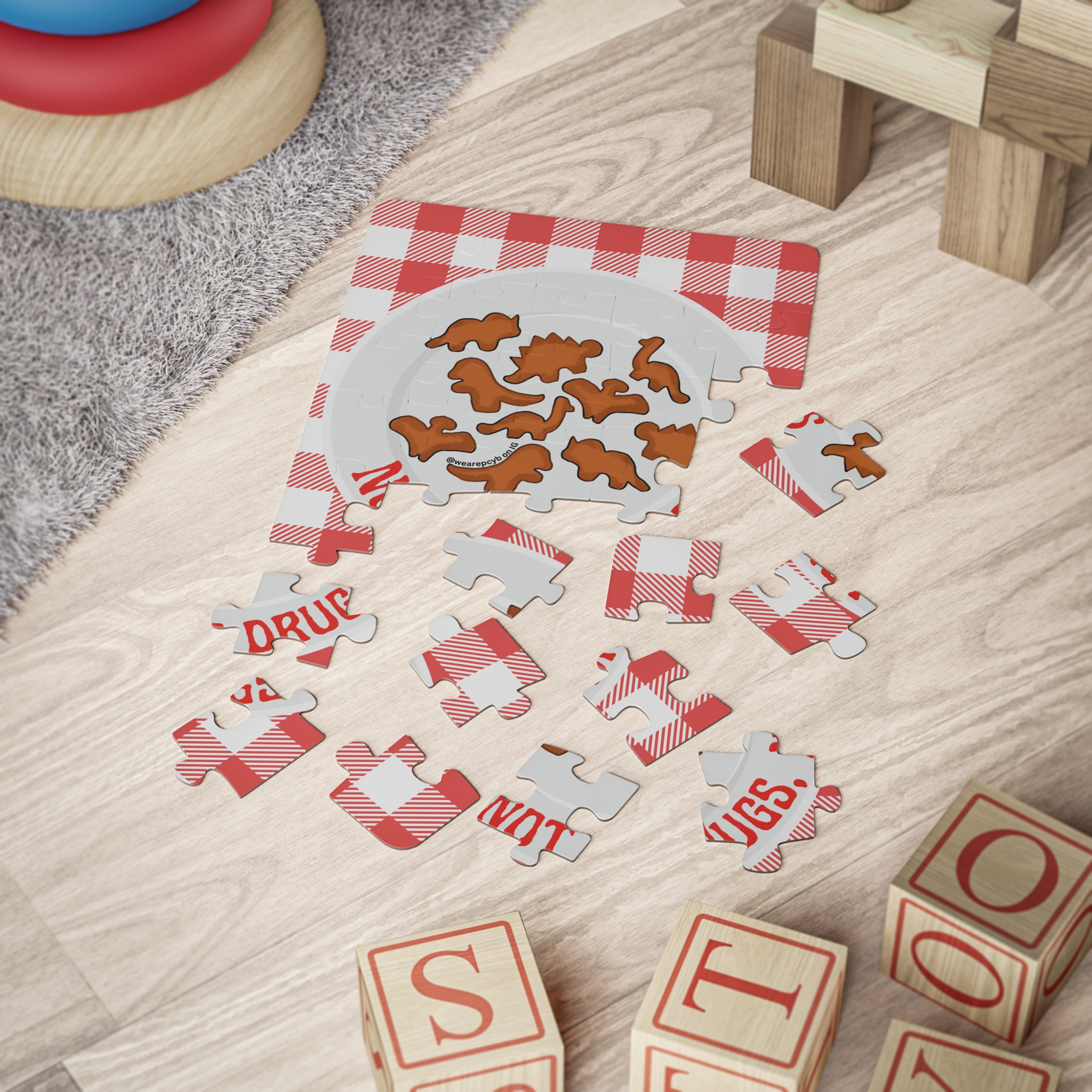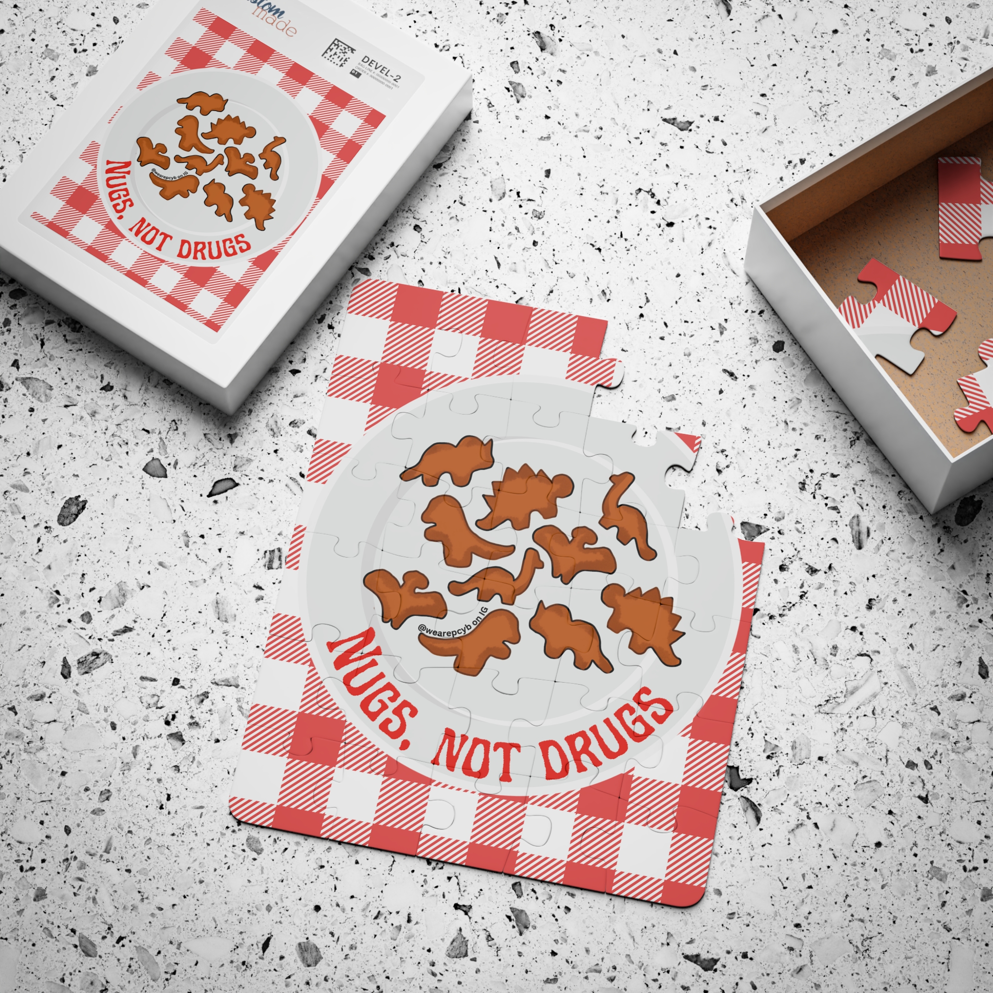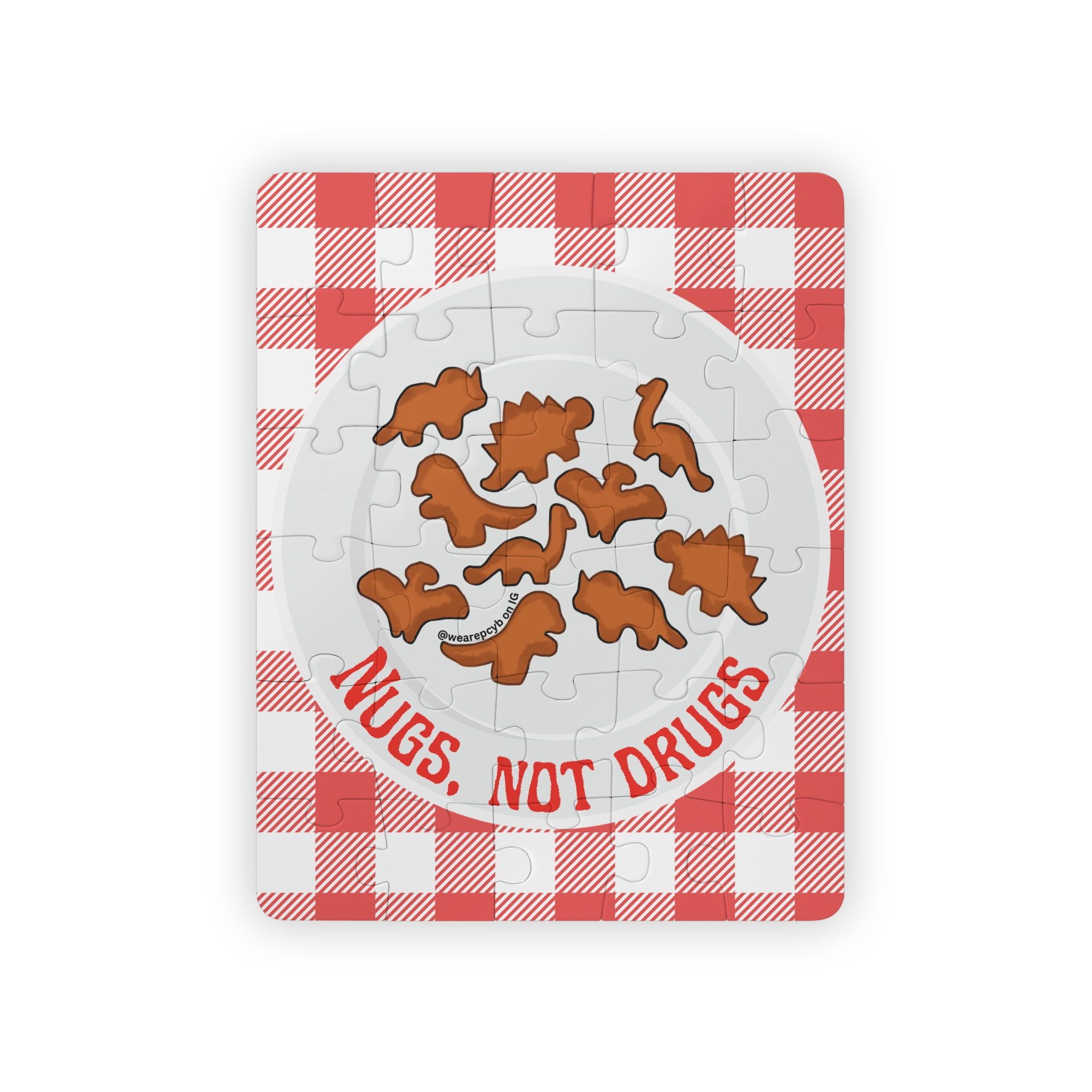 Introducing our fun and educational 30-piece puzzle for kids, featuring a playful design of dinosaur-shaped chicken nuggets arranged on a picnic blanket! This colorful puzzle showcases a plate with the quirky and positive message: “Nugs, Not Drugs.” It’s a delightful way to encourage healthy choices and positive habits while sparking imaginations with a love for dinosaurs and fun foods.